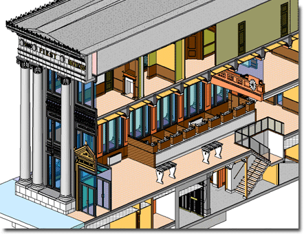 Creation of 3D Revit model from as-built drawings, measured survey sketches and photographs for a 22,000 SFT Bank (two levels + basement)
